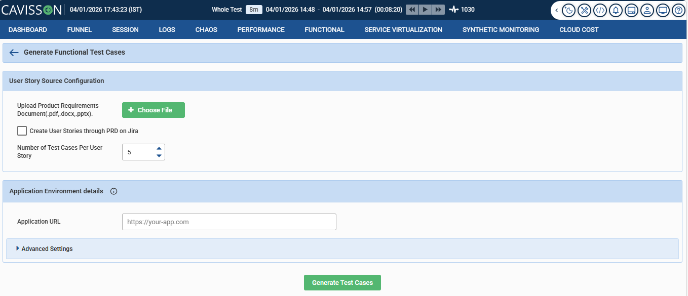 Before getting into the mechanics, let’s ground this in reality. Here’s Cavisson’s “Generate Functional Test Cases” screen — the starting point for the entire PRD-to-test pipeline: